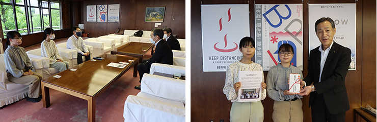 この募金を寄付するため、活動に参加した学生の代表が5月26日(木)に別府市役所を訪問しました。 同市ではいまウクライナから避難をしている7世帯18名の方々を受け入れており生活支援をしています。これまでの活動を通じて集めた募金、計20万円を、阿南寿和副市長に直接、手渡しました。