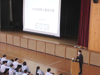 事前に希望のあったSNSの危険性や犯罪行為等について、『SNSの利用と違法行為』と題し、各種法律や情報モラルの考え方について講演が行われ、1年生と3年生は体育館で、2年生はリモートで聴講しました。