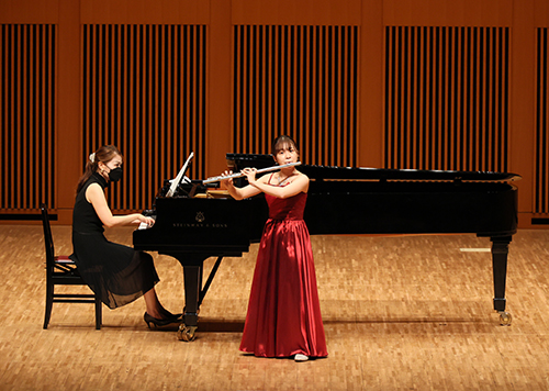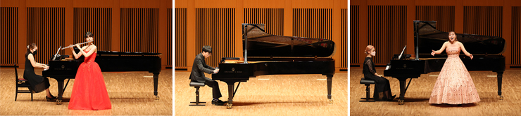 本学音楽科・専攻科音楽専攻の前期実技試験成績優秀者を、声楽・ピアノ・管弦打の各コースから選抜し、独唱・独奏曲による演奏を披露するもので、今年は13名の学生が出演しました。