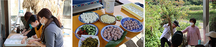 そこで昨年度に続き、同市にある「ちよみ自然農園」において、古代米の収穫および掛け干しの支援を行いました。掛け干しは昔から伝わる伝統農法で、稲を適度な乾燥状態に保ち、栄養を穂先に集めることを目的に行われています。また実際に農家でとれた古代米、もち米、麦、雑穀などを使って、おにぎり、お餅、漬物や大分の伝統料理であるだんご汁などを自分たちで調理し、実際に試食しました。