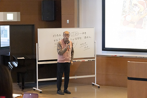 11月2日(水)、「アートマネジメント演習Ⅰ」の授業として、作曲家、ピアニスト、指揮者、イラストレーターなど、多彩な経歴をもつ著名なアーティスト 青島広志氏をお招きし『初期少女漫画の魅力』と題して講義を開催し、学生や教員等約40名が参加しました。