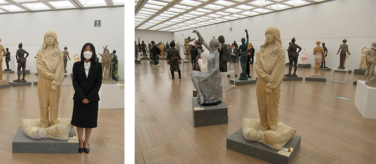 この作品は酒井さんが短大時代に卒業制作展に向けて制作したもので、同公募展へ出品するために、作品をブラッシュアップさせて出品し、見事特選に選ばれました。当日は小手川大助学長、担当教員の白石恵里助教と共に来庁し、出品までの経緯や、11月17日に都内で行われた授賞式について報告しました。