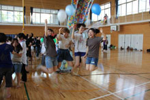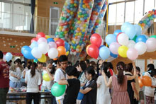 2日の府内戦紙につづき、3日に開催された「七夕ブロードウェイ2013」(大分青年会議所主催)には、延べ約80人の学生が参加しました。当日は、14時から荷揚町小学校体育館に集まり、これまでで最も多い1万個の風船をつくりました。