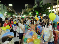 20時前から「47万人の広場」にチューブにいれた風船を持って移動、集まった市民や子どもたちに風船を配り、21時10分の風船リリースに備えました。「星に祈りを」などのおなじみのメロディーを大合唱したあと、風船が一斉にリリースされました。人々の祈りと願いを乗せた風船は、高く高く舞い上がり、夏の夜空に消えていきました。