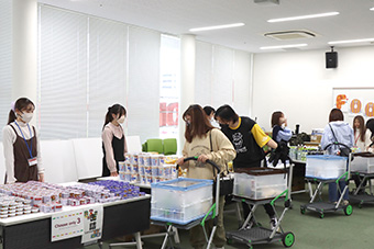 朝9時から活動を開始し、フードバンクおおいたの準備した食材等の運搬や製品の陳列、お米の小分け、会場設営などを行い、午後12時から15時までの間に約150名の留学生らに、お米、レトルト食品、缶詰、飲み物、インスタント食品、調味料などを提供しました。各食材コーナーでは、参加した学生たちが積極的に留学生達に話しかけ、支援と交流を心掛けました。またフードバンクおおいたの取り組み内容について、藤田亘宏所長から直接、お話を聞き学習する機会も設けられました。