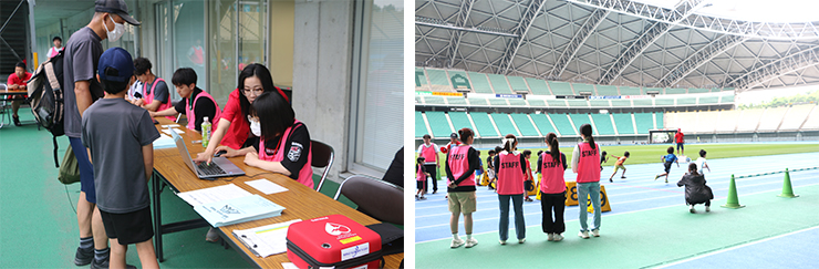 当日は、小学生低学年から中年のクラスまで、200名を超える選手が男女別で10のクラスに分かれ、予選会を行いました。参加した学生は、事前説明を受けた後、受付、PR、記録・ゼッケン、トラックの各班に分かれ、選手のサポートを行いました。