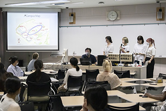 最初にゼミの学生による本学のキャンパスや、日本文化の紹介を行い、紹介の最後には学生が用意した折り鶴が贈られ、ようかんも振る舞われました。