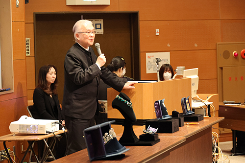 当日はアルビオンアート株式会社のジュエリーコレクション5点を展示され、各宝飾品の時代背景や芸術作品としての鑑賞のポイント等をご説明いただきました。またご自身が40年間ジュエリーを取り扱ってきた中で書き留めてきた随筆の中から、芸術を学ぶ学生にプラスになる言葉を選び、志を高くもって挑むことの大切さについて経験を踏まえてご教示いただきました。