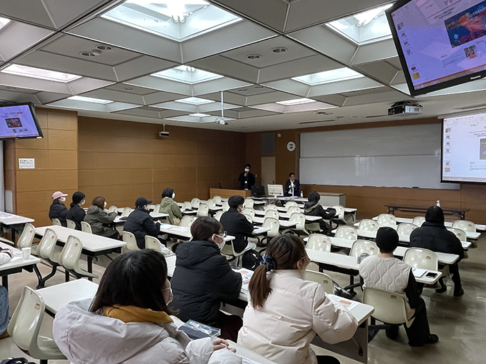 12月19日(火)3限「メディア・コミュニケーション(担当:吉村聡志専任講師)」にて、外部講師にBSよしもとで地域戦略を手掛ける高橋真氏(BSよしもと地域事業局長)を招いて特別講義を行いました。
