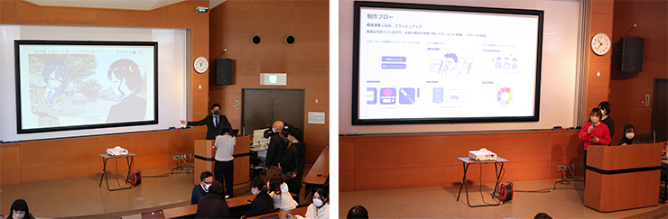 発表会には関係者が出席し、各研究室の取り組みの経緯の説明の後実際に制作した動画を視聴しました。