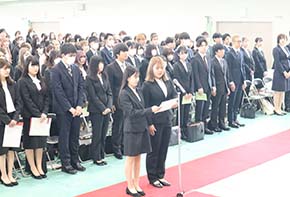 小手川大助学長が式辞で「失敗を恐れずに地域社会に出て行って挑戦を繰り返し、最高に中身の詰まった二年間としてください」と新入生を激励し、短大と専攻科それぞれの入学生代表が「学則を堅く守り、学生としての本分をつくす」ことを宣誓しました。