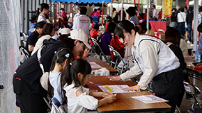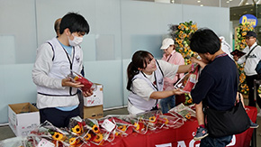学生スタッフとして参加した学生は、各ブースの担当者からレクチャーを受けながら、横浜キヤノンイーグルスのSNSキャンペーンや来場ラリーに関する広報活動、また、来場者への大分県産ひまわりのプレゼントやネイルシール体験コーナーといったスタジアム運営のサポートを行いました。県内外から来場したお客様一人ひとりに声かけを行い、試合会場の雰囲気を一層高めることに頑張っていました。