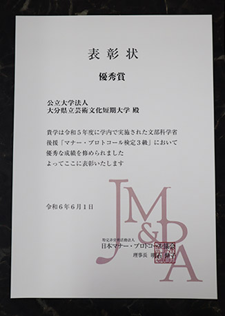 NPO法人日本マナー・プロトコール協会が主催する「マナー・プロトコール検定試験」において、本学が令和5年度の「優秀校」に選ばれました。令和2年度に続き、2回目の受賞となります。