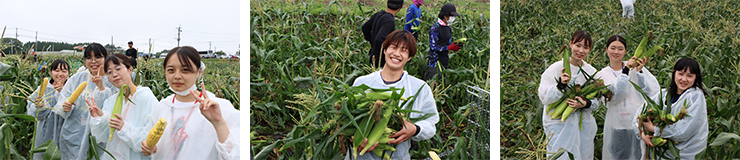 畑ではメロンの糖度以上(糖度は18度~20度)のもぎたてのとうきびを、生のまま全員で頂きました。そして畑のとうきびを全て収穫しました。その後は3グループに分かれて、とうきびを使った食品加工、道の駅における青果と加工品の商品販売、一般の方々のとうきび収穫体験の支援業務を行いました。