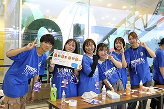 7月14日(日)にサービスラーニングの活動として、レゾナックドーム大分で開催されたサッカーJリーグの「大分トリニータ対清水エスパルス」の試合でフェイスシールの販売を行いました。