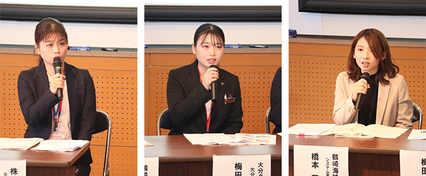 今年は株式会社大分銀行 村上あずささん(情報コミュニケーション学科卒業)、大分ダイハツ販売株式会社 梅田明日香さん(国際総合学科卒業)、鶴崎海陸運輸株式会社 橋本奈々子さん(国際総合学科卒業)が、在学中に行った就職活動や内定に至るまでの心境、就職後の体験を話しました。