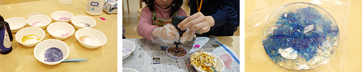 今回のテーマは「コースター作り」。参加者の皆さまは、コースターの型に色素材を使って自由に柄を描き、最後に型枠にレジン液を流し込んで作品を仕上げました。