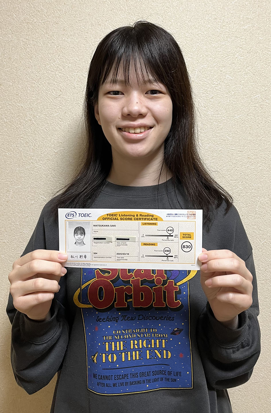 国際総合学科2年の松川紗希さんは、1年生後期に履修した「実務英語」の講義(担当:田中友紀先生)で、英語コミュニケーション能力を測る試験であるTOEICを知り、3回目の挑戦で830点という素晴らしいスコアを獲得しました。このスコアは、ネイティブとの込み入った内容の会話が理解でき、専門的な文章も難なく読みこなせるレベルです。