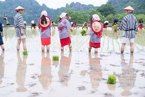学生たちは、宇佐神宮神職による神事の後、中世の装束を身にまとい、現代ではあまり見られなくなった手植えによる御田植を体験しました。泥にまみれながらも、伝統的な農作業を楽しむ貴重な一時となった様です。