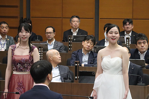 約30年ぶりに更新された県議会議場の運用開始を記念して、佐藤 樹一郎県知事をはじめ、多くの県議会議員が見守る中、本学の専攻科音楽専攻科生が議場にてコンサートを行いました。