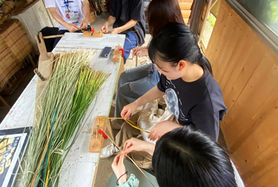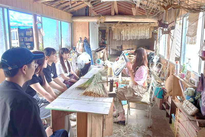 学生たちは「サステナブルツーリズム論」の講義で、江戸時代に七島藺を豊後へ伝え、新田開発や栽培促進に尽力した先人たちについて事前に学習。その成果をもとに、工房では岩切氏から七島藺の栽培や加工、製品製作の工程について詳しい説明を受け、理解を深めていました。さらに、七島藺を使ったアクセサリー作りを実際に体験し、伝統素材に触れる貴重な機会にもなりました。