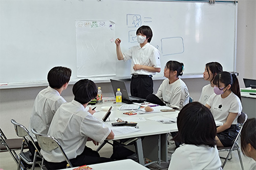 続いて、シナリオのドラフト作成やキャラクターデザインに取り組みました。シナリオ制作では「視聴者にどうすれば共感してもらえるか」「視聴者の意識や行動を変えるにはどのような表現が適切か」など、ホワイトボードやスケッチを囲みながら意見を出し合い、熱のこもった議論が交わされました。キャラクターデザインでは、ビジュアルだけでなく性格や背景設定を深掘りし、学生たちは熱心かつ楽しそうにアイデアを出し合って形にしていきました。