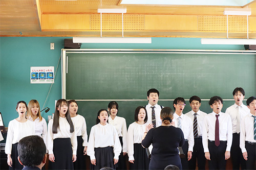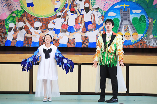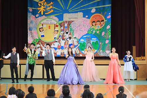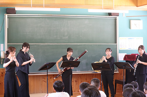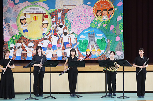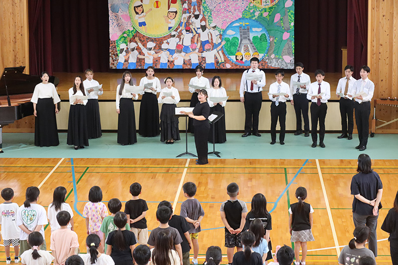 児童の皆さんに最後まで楽しんでもらえるようなプログラムや進行を考え、オペラハイライト、ピアノ連弾、弦楽アンサンブル、木管五重奏、金管五重奏、合唱などを披露しました。また、最後には児童の皆さんと一緒に校歌を歌いました。