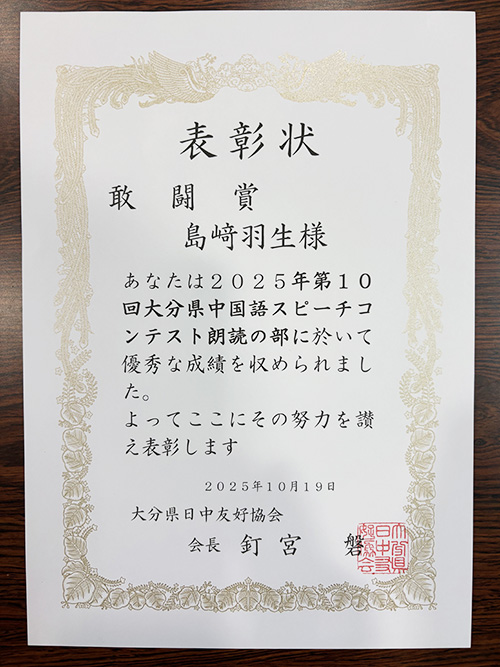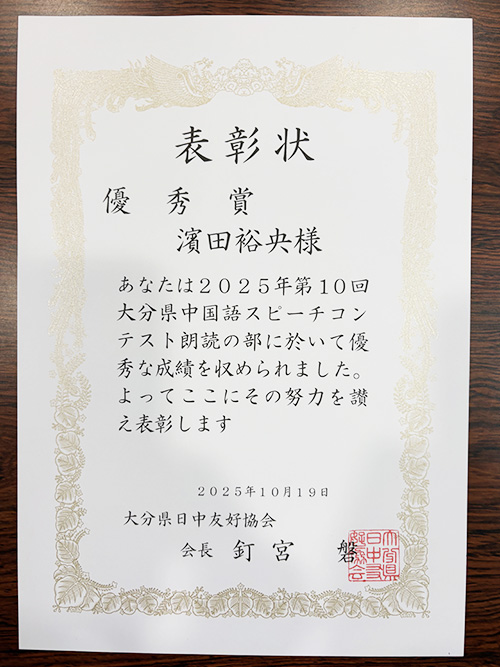 2025年第10回大分県中国語スピーチコンテストで本学学生が受賞しました