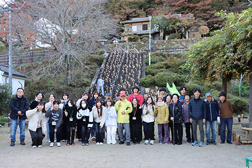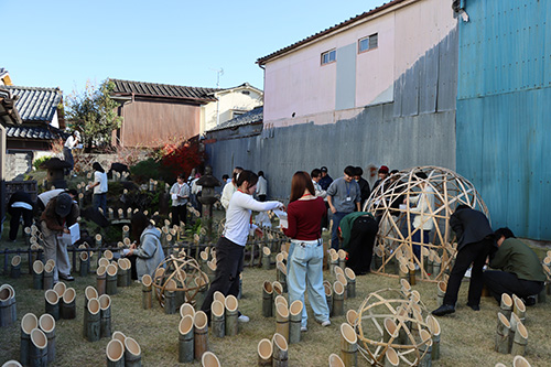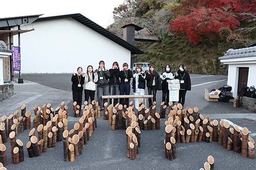 竹楽は大分県を代表する晩秋の風物詩となっており、市内各地に2万本の竹灯篭が設置され、多くの観光客が訪れる一大イベントになっています。事前に地域社会特講2の講義で、主催団体の代表者から里山保全の取り組みの一環としての「竹楽」の位置づけを学習した後、現地での活動に学生達が参加しました。