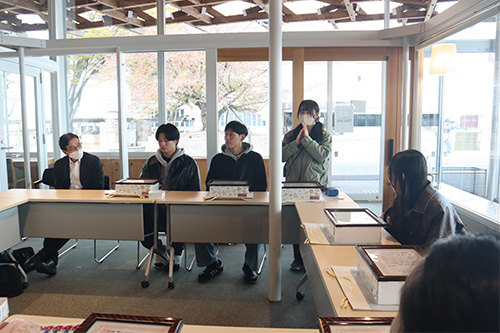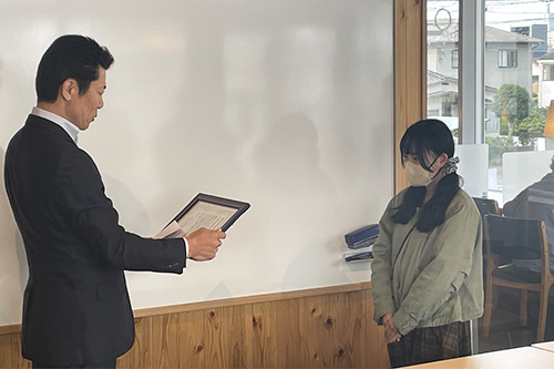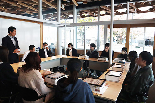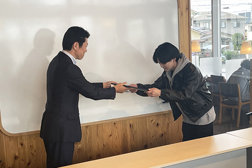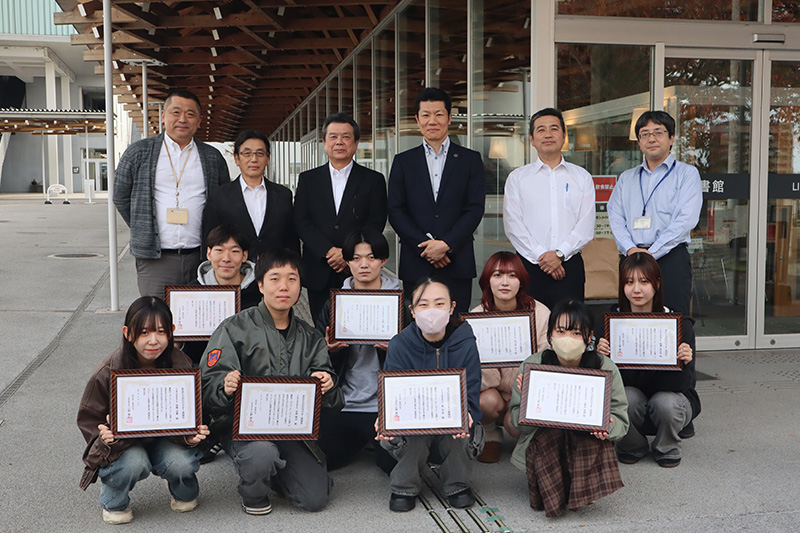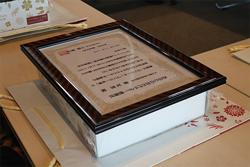 これまでの長期にわたるゼミ活動に関して謝意を直接学生に伝えるべく、11月17日(月)ガンジーファームを経営する㈱まるひでの小野社長をはじめとした役員の方々が来学、吉村ゼミの学生それぞれに感謝状と記念品の授与が行われました。