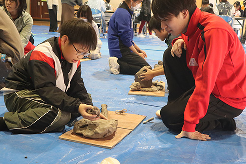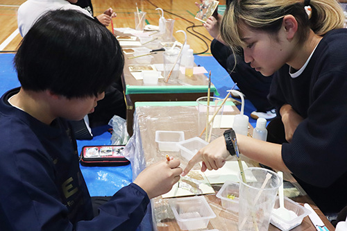 美術専攻の4分野に分かれ、それぞれの専門を活かしたワークショップを実施し、美術専攻1年生と、小学校5、6年生の児童ら47名が参加しました。