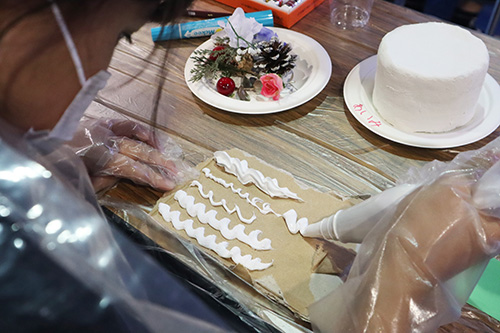 当日は、箔や日本画材を使った絵画、マグネット型キャンバスに油絵体験や粘土を使った造形活動、いろんな材料を使用したフェイクケーキ作りを行い、自由に制作しました。児童は普段とは違う画材に苦戦しつつも、学生のアドバイスを受け、楽しく個性あふれる作品を仕上げました。