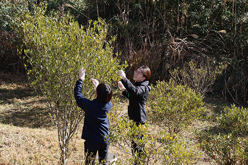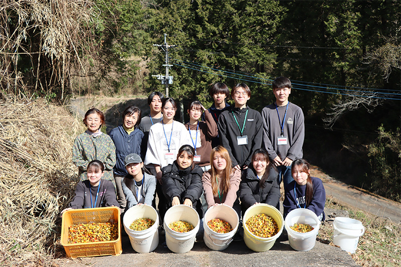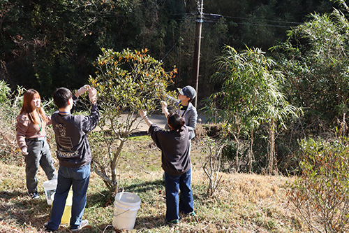 1月17日(土)に、サービスラーニングの一環として、大分市野津原福宗地区において、くちなしの収穫支援を行いました。くちなしは食材や繊維の着色料(黄色)として用いられるほか、大分県内では臼杵市の郷土料理である「黄飯」にも用いられています。