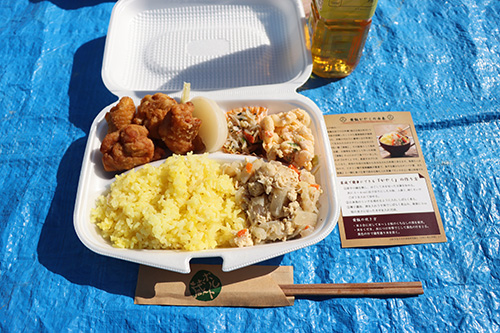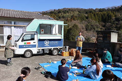 活動では、畑にある約50本のくちなしの木から実を全て収穫しました。その後は臼杵市にある「ポルト蔵」の方にキッチンカーで現場に駆けつけて頂き、同市の伝統料理である「黄飯」と「かやく」を使ったお弁当を提供していただき皆で堪能しました。またその後は道の駅のつはるに移動し、同地域の観光の可能性と魅力について理解を深めました。