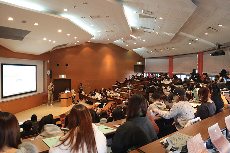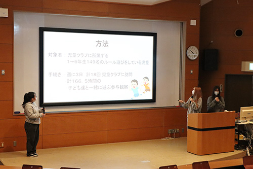 心理スポーツコース、地域ビジネスコース、情報コミュニケーション学科の3コースから、12研究室、計44の研究内容について発表が行われました。この発表会は、1年間の研究成果を広く公表し、大学での学びの集大成の位置づけにあたります。会場には同学科1年生・2年生が参加し、発表後は活発な質疑応答が行われました。