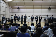 最初に、これから始まる学生生活についての心がまえや共通教育科目の履修方法、防犯講和、サークル紹介など全体的な説明を行った後、各学科に分かれました。