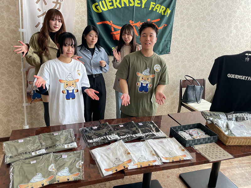 課題把握を行った学生による解決へのアプローチとして下記の2つに取り組んできました。一つ目のアプローチはZ世代に刺さる商品開発です。メンチカツにするか、ホットドックにするか、地元大分の食材を使ったディップを食べ比べるなど試食と検討を重ね、今回「ガンジー牛の雄牛」を使ったハンバーガーの商品化を実現しました。二つ目のアプローチは、ガンジーファーム、及びガンジー牛、新商品となるハンバーガーのブランディングや商品認知です。今回、「ファーム自体の認知」「ガンジー牛の魅力の認知」「新商品であるハンバーガーの認知」に向けた動画の制作、さらにあらゆるシーンで使えるようなガンジー牛の新キャラクターデザインを作成しました。ハンバーガーの包装紙をはじめ、商品ののぼり、ショップで販売するTシャツ、ボンボンドロップシールなど広く使えるようにしました。