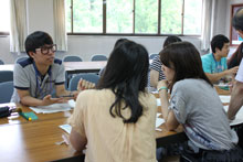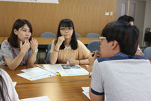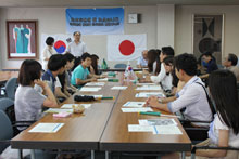 交流会では、国際総合学科2年の里谷真理子さんと川野祥子さんが韓国語で挨拶と学校紹介を行ってから、学生同士の意見交換会を行いました。ここでは、グループに分かれて会話をし、その後それらを発表する、という形をとりました。みなさん、趣味や好きな食べ物、好きな芸能人、スポーツといった若者らしい話題から、軍隊のことまで、とても盛り上がって話をしていました。学生たちは「韓国語を少しだけしゃべることができるので、いい勉強になりました。韓国の学生が、一生懸命日本語を使ってくれたのも嬉しかったです」「短い時間でしたが、いろんな話ができたのがよかったです。大邱に来る時はぜひ連絡してください。しっかりサポートします!」と感想を述べました。