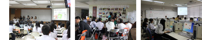 説明会後は、各科に分かれ、授業風景の紹介やミニコンサート、ネイティブ教員との語学体験や実際にPCに触れるメディア体験などを実施しました。