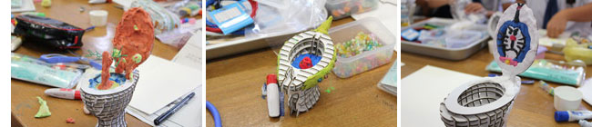 24日の第2回目では、1回目で作成した模型にクラフト粘土やビーズ、貝殻、マスキングテープなどを使って装飾をしていきました。だいたいのイメージ案を考えて制作に挑んだのですが、みんな作っていくうちにどんどんアイデアが沸いてきて、頭の中で描く独自の“オリジナルトイレ”に仕上げていました。