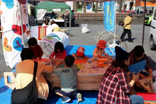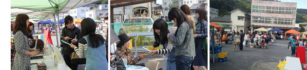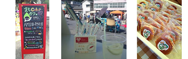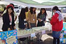 会場では、佐伯市の若者グループと本学の学生が、地元特産のマリンレモンと大分合同新聞社の屋上でとれたハチミツを材料につくった、ママレードとレモンスカッシュを販売しました。また、「ギネスに挑戦!おおいたアートスネイクプロジェクト」のアートスネークづくりワークショップ、美術科学生がデザインしサービスラーニングで宣伝販売する「赤い羽根ボールペン」の販売宣伝を行いました。