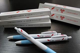 このボールペン(1本200円)は、本学事務局窓口と『コトブキヤ文具駅南店』で募金として呼びかけています。ぜひ、ご協力をお願いします。なお、11月2日(日)、ホルトホール大分で開催される「文具フェスタ」で、PR活動を行います!みなさま、ぜひ遊びにいらしてください!