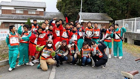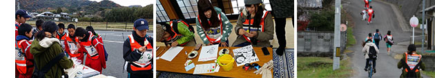 最初のミッションは、木佐上地区の3つの神社でヒントを元にクイズを解いて担当の学生に答えを知らせるというものです。たとえば、大木というヒントを与え大木の下にカードを置いて、自然のにおいのするもの3つ探せ、といった感じです。制限時間内にクリアーできればOK、制限時間が来れば担当の学生はハンターとなり自転車で追っかけます。ゼッケン番号を通報されれば、本部まで帰って数学の問題3問を解くまで参加できません。これを、3つのチームに分かれて、得点と時間を競いました。