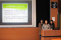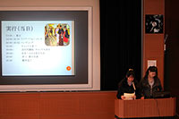 商店街と本学学生が主体となって行うイベント「府内学生フェスタ」について、当日のスケジュールをおって活動内容を細かく説明しました。また、準備段階での反省点等もあげ、来年度の活動に生かすよう、改善点も述べました。