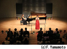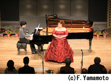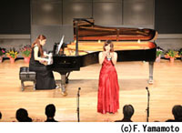 トリを飾ったのは、メゾソプラノの山口優里菜さんの歌声(ピアノ伴奏:山中惇史さん)。山口さんは、本学を卒業後、2013年に東京藝術大学声楽科を首席で卒業。演奏曲目は、①G.ロッシーニ: 誘い(いざない) ②山中惇史: たんぽぽ ③C.サン・サーンス: オペラ「サムソンとデリラ」より『あなたの声に我が心は開く』 ④G.ヴェルディ: オペラ「ドン・カルロ」より『むごい運命よ』。 歌曲からオペラアリアまでバラエティに富んだ演奏曲目を豊かな声量と見事な表現力で歌い、その迫力があり、艶やかな歌声に、多くの聴衆は魅了されました。