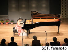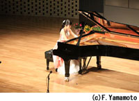 後半に登場したのが、ピアノ演奏で首藤里佳さん。首藤さんは、本学短大と専攻科を卒業修了しています。演奏曲目は、S.プロコフィエフ:ピアノ・ソナタ 第6番 op.82より 第1、4楽章。 プロコフィエフ特有の激しい不協和音の連続や独特のリズムを有する難解な曲を力強く弾きこなして、聴衆の拍手をいただいていました。