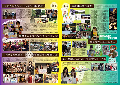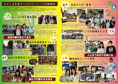 本年度実施したサービスラーニングについて、1月のサービスラーニング発表会を元に学生が文章を書いてつくったのがこの「Voice~ヴォイス~」です。今年の特徴は、臼杵情報発信・佐伯まちcolorカフェ・鶴崎二十三夜祭など、地元出身の学生が年間を通じて地元のために行った活動がふえてきました。また、森林セラピー事業・おおいた活性化ネットワーク・子どもキャンプ・たけた情報発信・わかもの映画祭・日韓次世代映画祭など、長い期間をかけて実施するプロジェクト型の活動が多くなっています。赤い羽根ボールペン・国際車いすマラソンボランティアなど、学科を超えての活動を多くなっています。