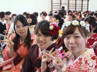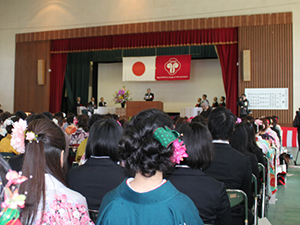 今日皆さんは、二年または四年間過ごしてきたこの上野丘のキャンパスを、次の目標に向けて巣立って行くことになります。これまで、学生同士、学生と先生や事務局スタッフの距離が近い、言い換えれば家庭的環境の中で学んできたことは、人生の中で貴重な経験であり、多くの思い出を胸一杯に巣立って行くことでしょう。