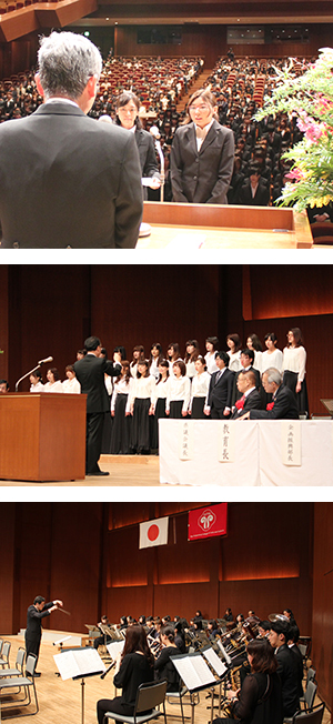 大分の芸術文化発信拠点の一つであるグランシアタでの式に、新入生、教職員とも決意新たなスタートとなりました。会場では新入生を歓迎して、在校生が「サクラトリロジー」(桜/コブクロ~さくら〈独唱〉/森山直太朗~桜/河口恭吾)とショスタコービッチ作曲「祝典序曲」を吹奏楽で演奏。コンサートのような雰囲気に、演奏後に保護者らからあたたかい拍手をいただきました。