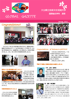 国際総合学科では活動報告などのホットなニュースやイベント情報を掲載している学科通信「GLOBAL GAZETTE」の春号を発行しています。春号では表面で卒業式、卒業研究発表会や新任教員紹介を、裏面では学生の語学実習の感想と昨年度退職された教員への贈る言葉が、多くの写真とともに掲載されています。